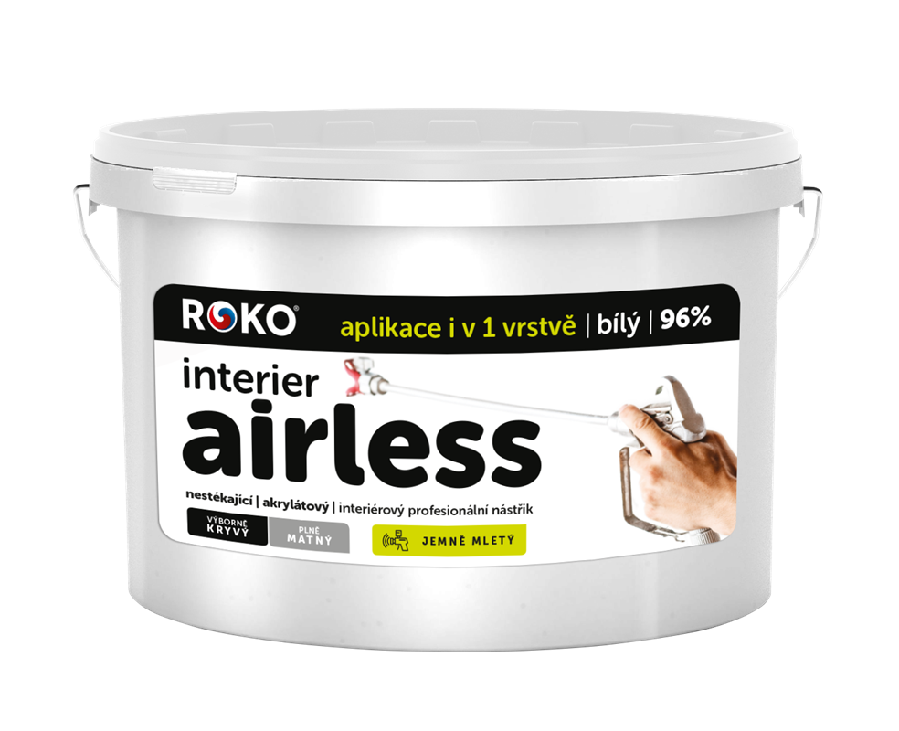 INTERIÉR AIRLESS je speciálně vyvinutá nátěrová hmota určená pro aplikaci výhradně vysokotlakým stříkacím zařízení (pístové, membránové). INTERIÉR AIRLESS se vyznačuje vynikají krycí schopností v jednom kroku při aplikaci vysokotlakým stříkacím zařízením, vysokou bělostí 96 %. Neucpává trysky a filtry (pistolové, strojové). Z důvodu použití mikromletých plniv nedochází k ucpávání trysek a filtrů (pistolové, strojové) a snižuje se výrazně opotřebení pohyblivých částí stroje. INTERIÉR AIRLESS má vyšší míru thixotropie, proto lze aplikovat při nižších provozních tlacích (100-120 bar), což se projevuje mimo jiné i nižší prašností při aplikaci. INTERIÉR AIRLESS Snadno se zpracovává. Nekřehne,nepraská a neodlupuje se. Odolává otěru za sucha. Má dobrou paropropustnost pro vodní páry.